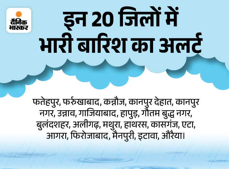 यूपी में मानसून जमकर बरस रहा है। आज मौसम विभाग ने 10 जिलों में हल्की तो 20 जिलों में भारी बारिश और बिजली गिरने का अलर्ट जारी किया है। मानसूनी बारिश का दायरा पूरब और तराई होते हुए अब पश्चिम तक पहुंच चुका है।
