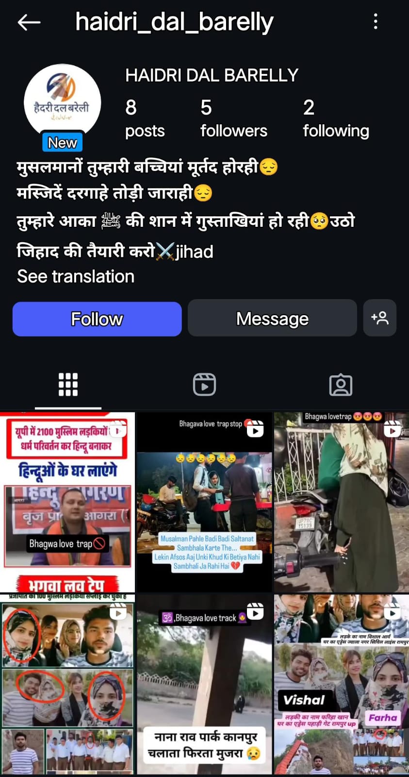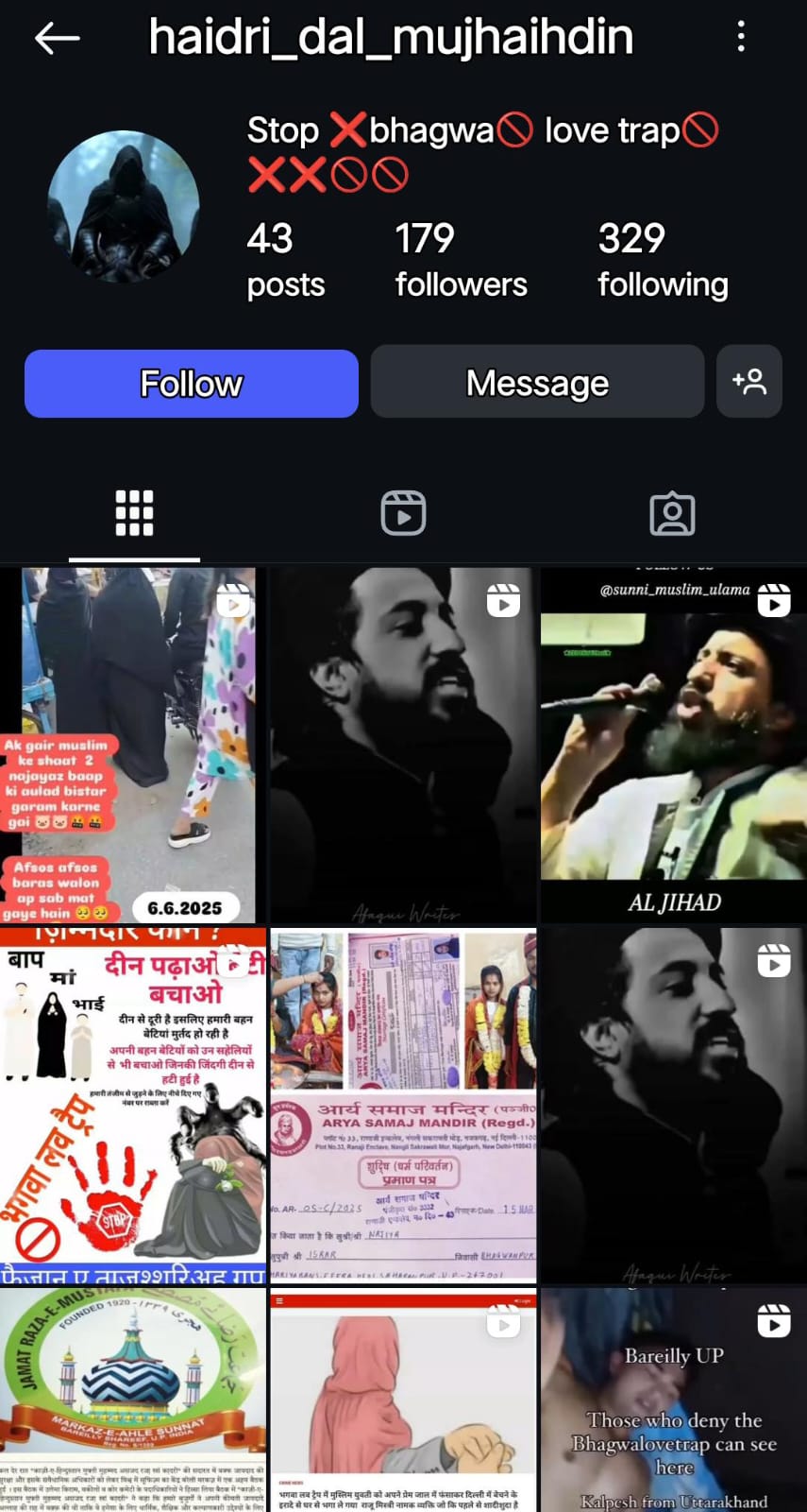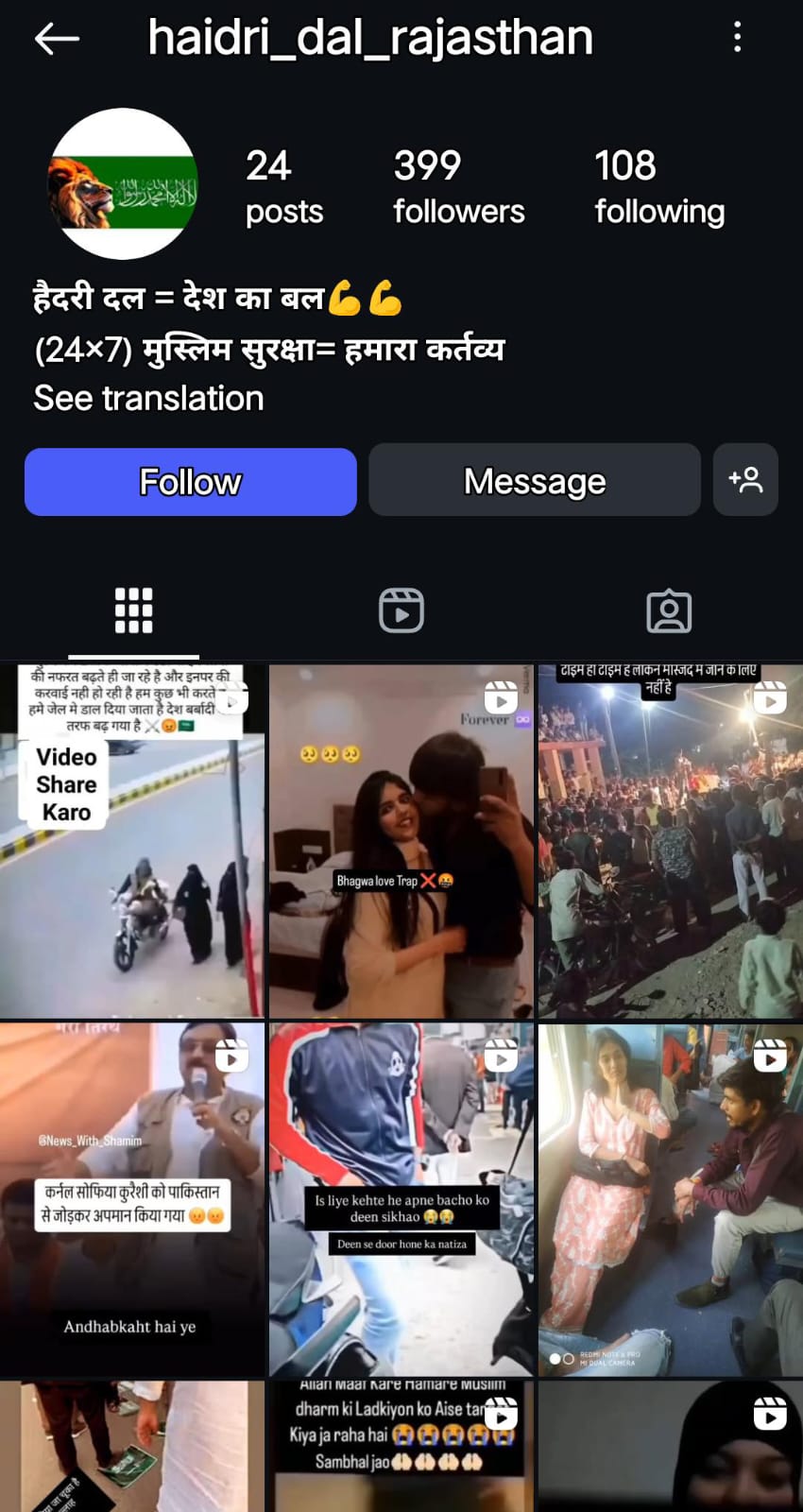 हैदरी दल का नेटवर्क केवल बरेली तक सीमित नहीं है। इंस्टाग्राम पर haidri_dal_rajasthan नाम से एक और अकाउंट मिला है, जिसमें 24 भड़काऊ वीडियो और 388 फॉलोवर्स हैं। इसमें बायो में लिखा गया है—‘देश का बल, 24×7 मुस्लिम सुरक्षा हमारा कर्तव्य’। यह बताता है कि ये संगठन कई राज्यों में फैल चुका है और सोशल मीडिया के जरिए नफरत का जाल बिछा रहा है।