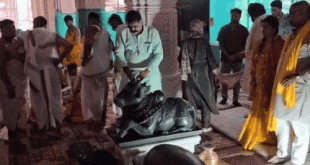 राम मंदिर के परकोट में खुद की बनाई नंदी की मूर्ति की प्राण प्रतिष्ठा के बाद उसका दर्शन करते …