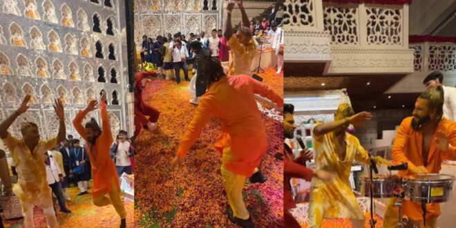 हाल में सामने आया हार्दिक पांड्या और रणवीर सिंह का ये वीडियो अनंत अंबानी की हल्दी सेरेमनी का है। हल्दी सेरेमनी के लिए राहुल वैद्य को परफॉर्म करने के लिए बुलाया गया था। ‘चौगाड़ा तारा’ गाने की पेशकश राहुल वैद्य ने की, जिसे सुनते ही रणवीर सिंह और हार्दिक पांड्या ने इशारों-इशारों में इस पर थिरकने का फैसला कर लिया। हार्दिक ने झट से अपना जूता उतारा और डांस करने के लिए आगे आ गए। इसी दौरान रणवीर सिंह भी आगे आए और दोनों ने मिलकर खूब डांस किया। हल्दी से लिपटे दोनों सेलिब्रिटी इस गाने पर गुजराती गरबा किए। इतना ही नहीं दोनों उछल-कूदकर भी खूब झूमते दिखे। सिंगर राहुल वैद्य और गुरदीप मेहंदी भी दोनों के साझ नाचने को मजबूर हो गए। दोनों का ये जोशिला डांस देखने वाले देखते ही रह गए और अब इनका ये वीडियो भी काफी वायरल हो रहा है।