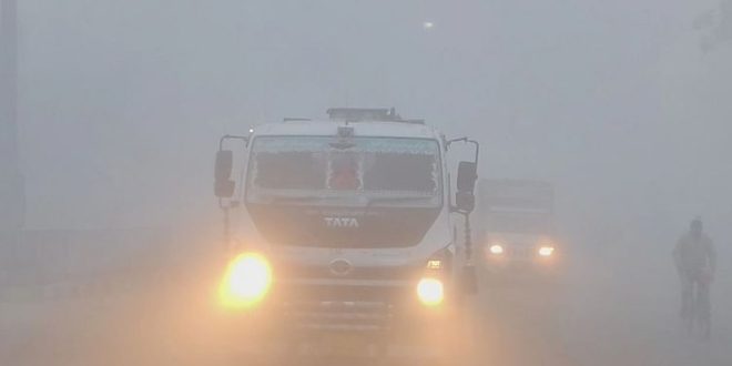 गोल चौराहा पर घने कोहरा से लाइट जलाकर निकलते वाहन।