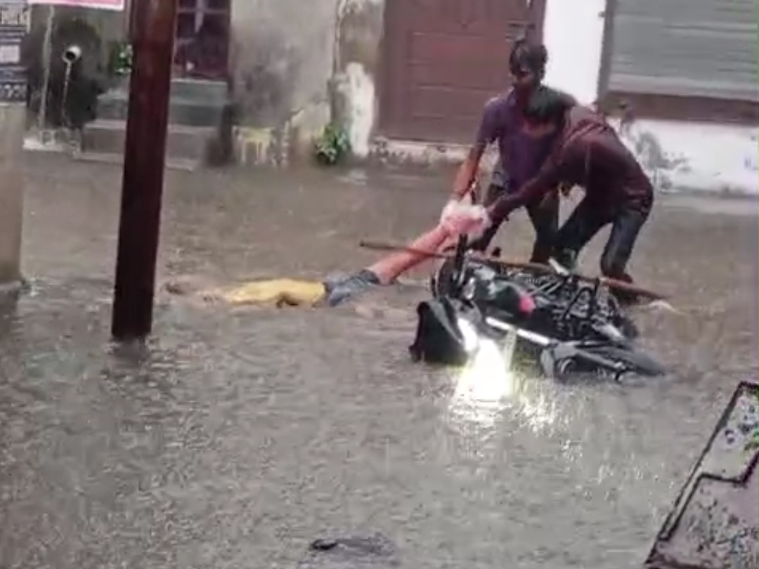 स्थानीय लोगों ने तत्काल कार्रवाई करते हुए युवक को बचाया और उसे पानी से बाहर निकाला। इस घटना का वीडियो सामने आया है। शहर में कई जगहों पर एक फीट से भी अधिक पानी भर गया था।