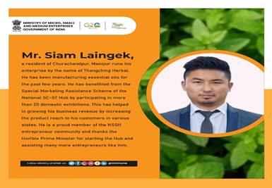मणिपुर के चुराचांदपुर के एक निवासी सियाम लैंगेक थांगचिंग हर्बल के नाम से अपना उद्यम चलाते हैं। पिछले कुछ सालों से वह अनिवार्य तेलों का विनिर्माण कर रहे हैं। उन्होंने 20 से घरेलू प्रदर्शिनियों में भाग लेकर राष्ट्रीय एससी-एसटी हब की विशेष विपणन सहायता स्कीम का लाभ उठाया है। इसने विभिन्न राज्यों में अपने ग्राहकों तक उत्पाद की पहुंच बढ़ाकर उनके व्यवसाय के राजस्व को बढ़ाने में उनकी सहायता की है। वह एनएसएसएच उद्यमी समुदाय के एक गौरवान्वित सदस्य हैं और हब आरंभ करने तथा उनके जैसे कई उद्यिमयों की सहायता करने के लिए प्रधानमंत्री को धन्यवाद देते हैं।
