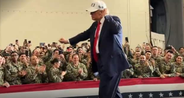 सोशल मीडिया प्लेटफॉर्म्स पर वायरल हो रहे वीडियो में राष्ट्रपति डोनाल्ड ट्रंप अमेरिकी नेवी के जवानों से घिरे हुए दिखाई दे रहे हैं और इस दौरान बैकग्राउंड में हैवी म्यूजिक बज रहा है. वहीं, स्टेज पर खड़े राष्ट्रपति ट्रंप अचानक नाचने लगते हैं. उनके माइकल जैक्शन डांसिंग मूव्स को देखकर वहां मौजूद सभी लोग हैरान रह जाते हैं, लेकिन इसके तुरंत बाद अमेरिकी नेवी के अधिकारी राष्ट्रपति ट्रंप के लिए जोरदार तरीके से चियर करते हुए नजर आते हैं.